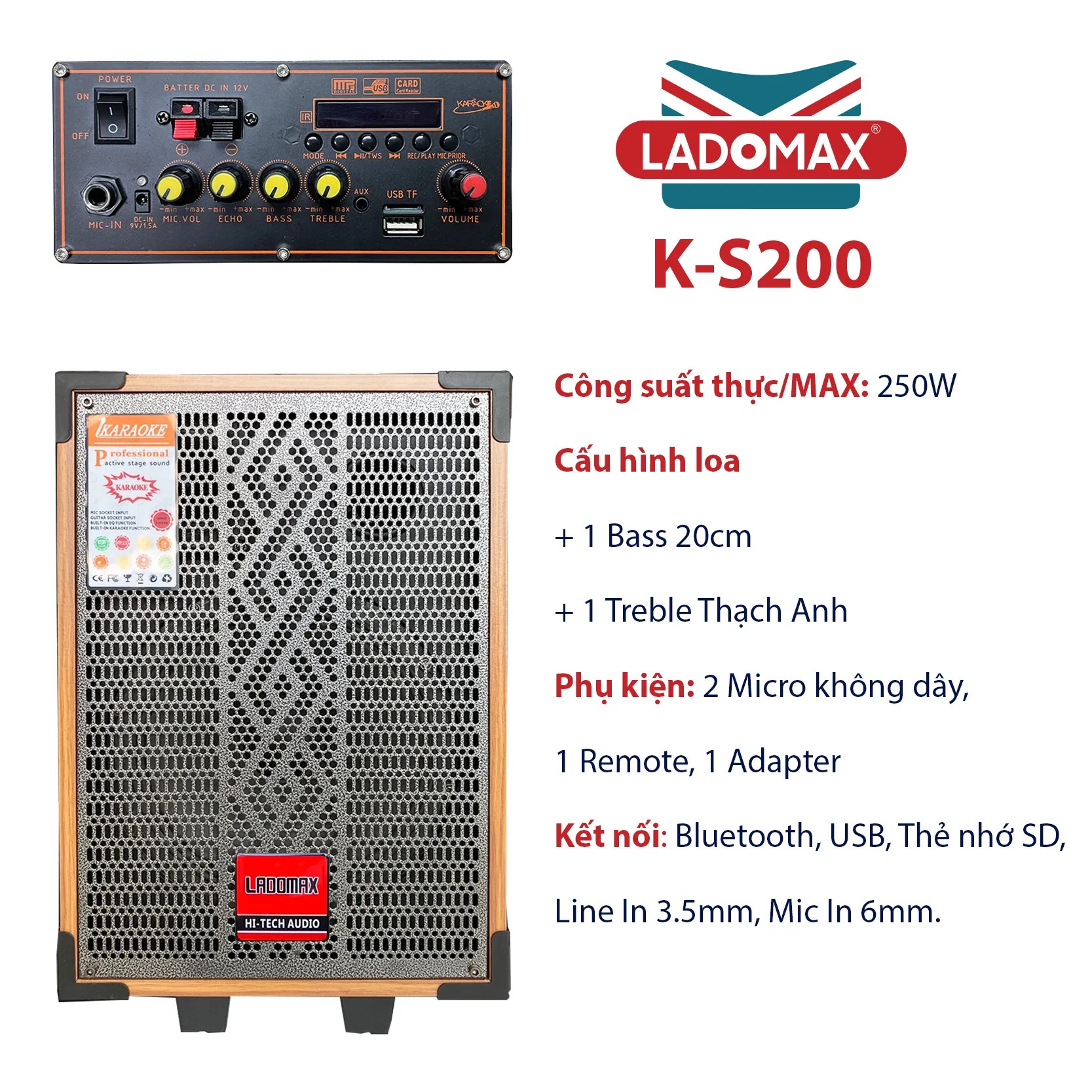 Kết nối: Bluetooth, USB, Laptop, Smartphone, SD, Remote, 2x Micro, 1x Ghita, FM